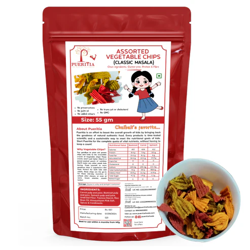 Made from a colourful blend of vegetables – Beetroot, Spinach, Carrot, and seasoned with Classic masala. These chips are not only delicious but also nutritious.